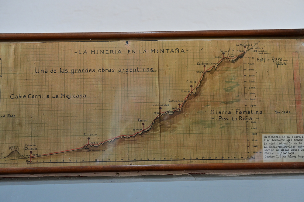 Die Seilbahn von Chilecito zur La Mejicana in 4600m Höhe wurde von der deutschen Seilbahngesellschaft Adolf Bleichert & CO erbaut. Sie war damals  mit 34km die längste Seilbahn. An 4 Stationen wurden Dampfmaschinen mit Dampfkessel zum Antrieb betrieben. Der Dampfkessel verbraucht 1 Tonne Holz in 45 Minuten. Deswegen gibt es ringsum keine Bäume mehr.