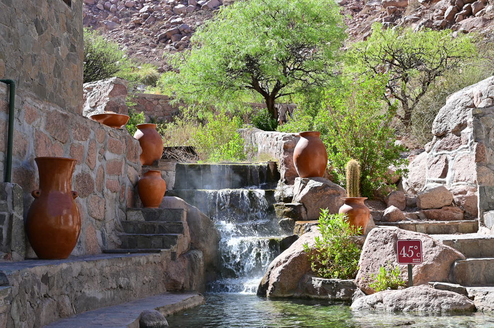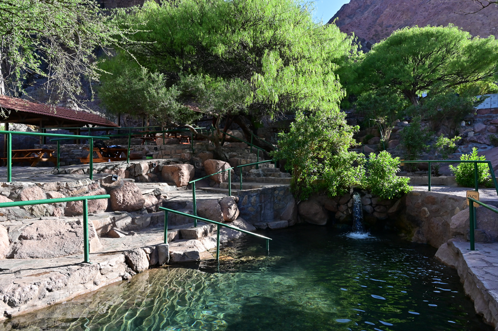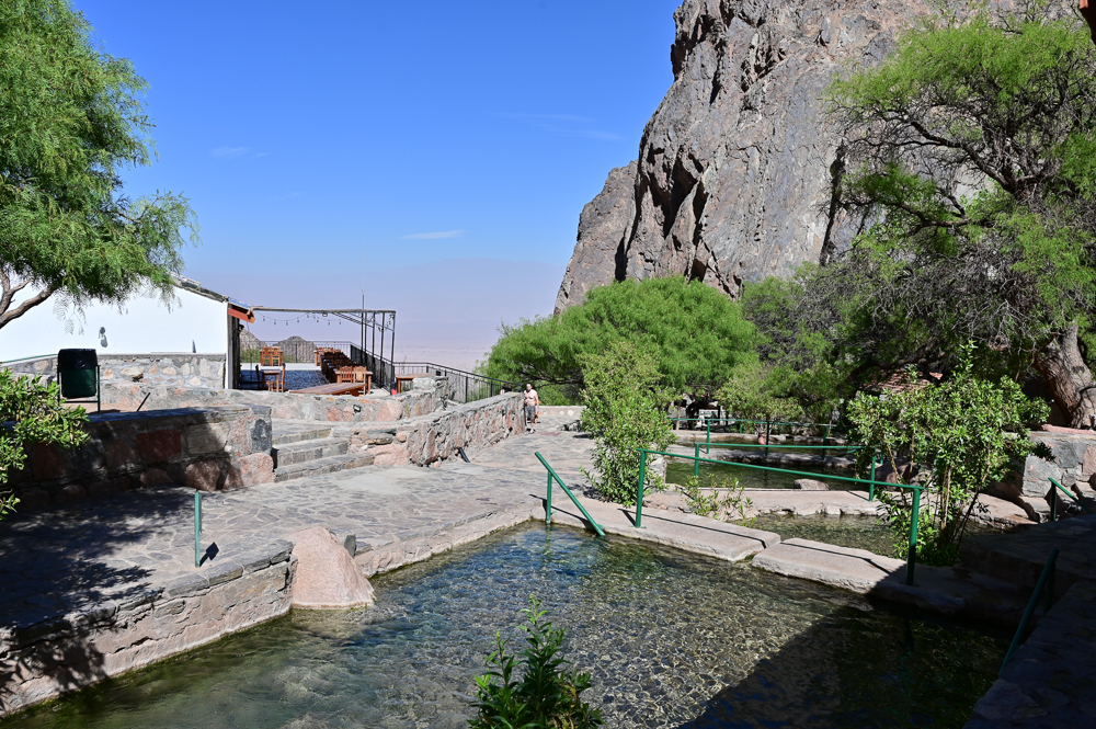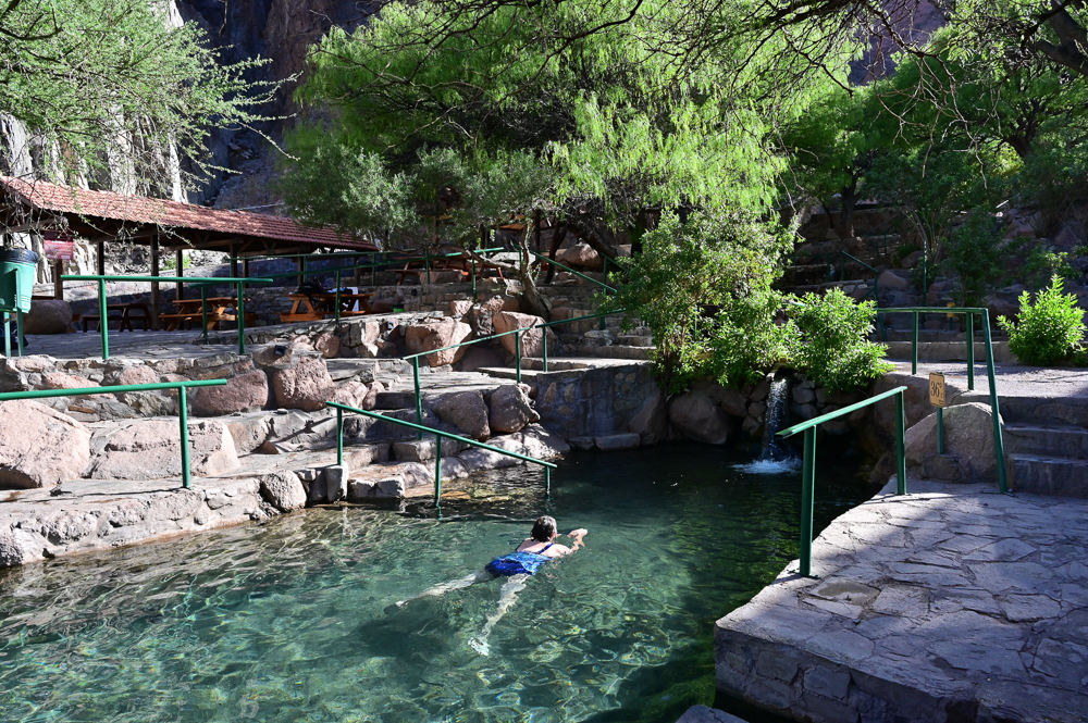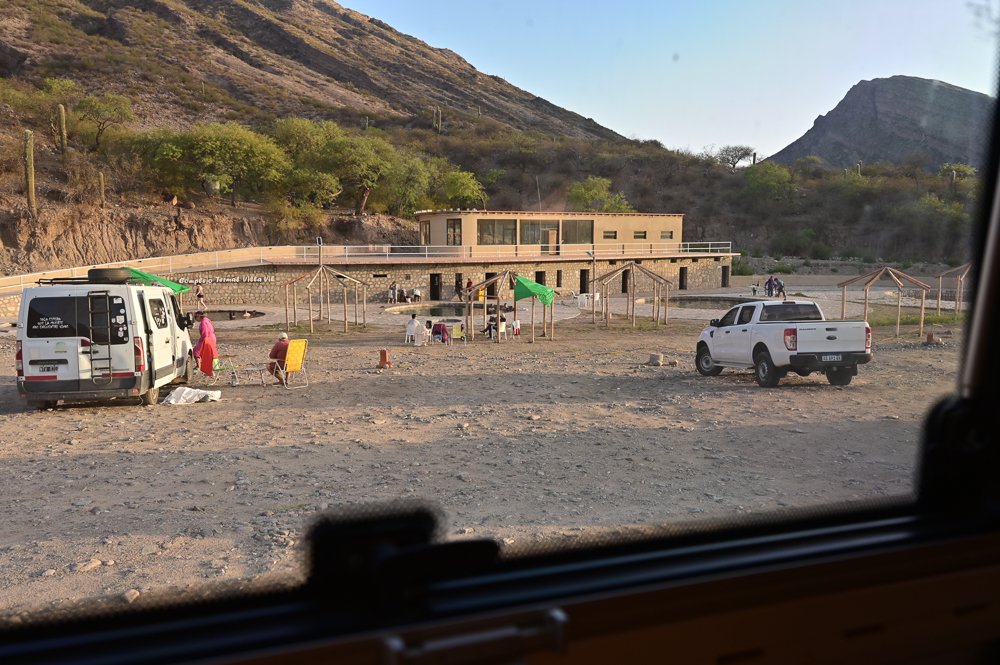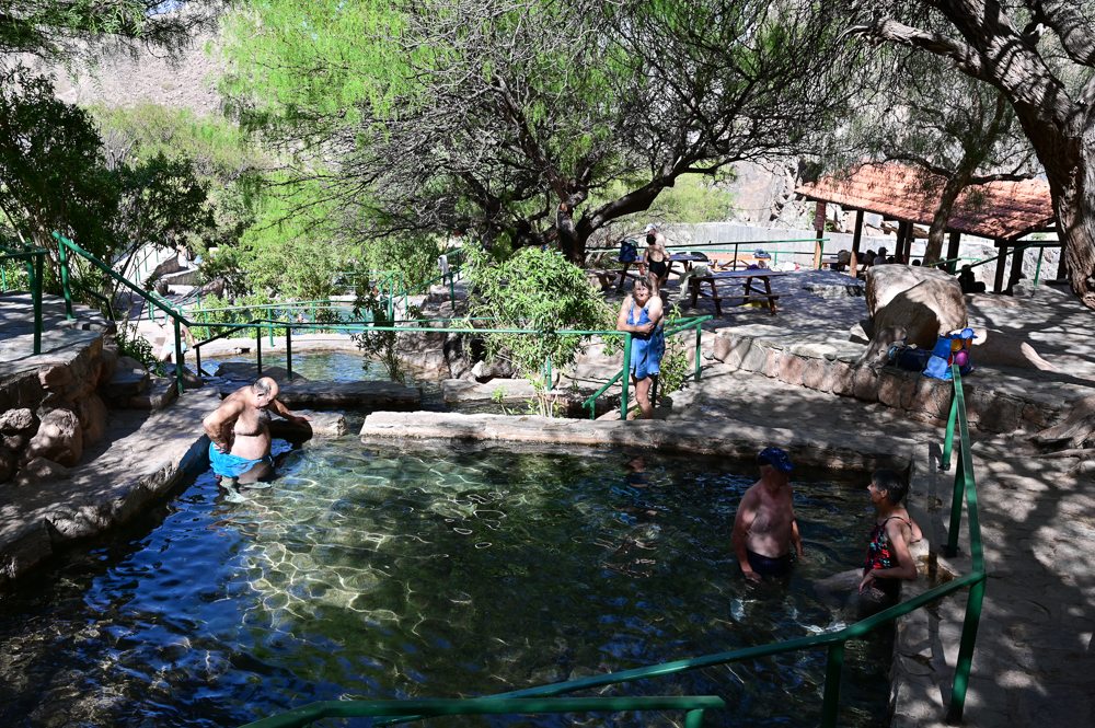 Gemeinsam mit Ursula und Fritz beschließen wir die Therme in Fiambala zu besuchen. Wir übernachten im Ort am Museum und holen uns gleich um 7:30 Uhr die Eintrittskarten. Es geht 18 km die Berge hinauf und oben erwartet uns die schön angelegte Therme. Das Wasser im ersten Becken beginnt bei 45 °C und kühlt sich über 10 Becken langsam auf 30 °C ab.