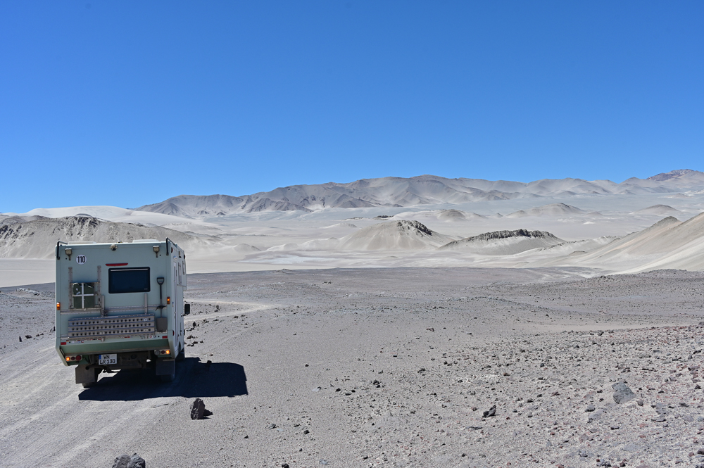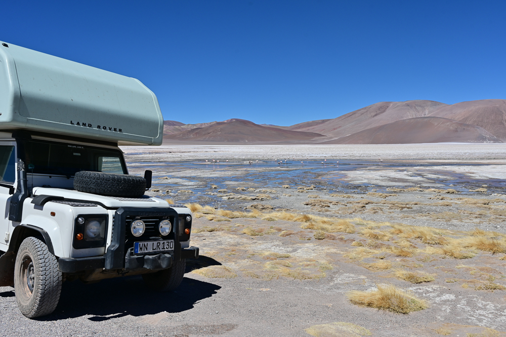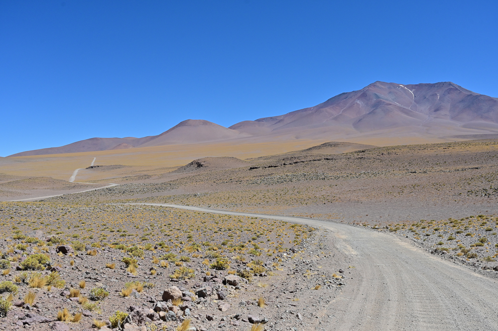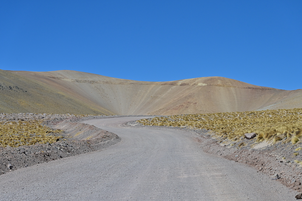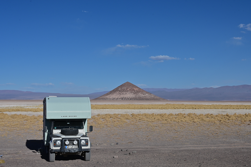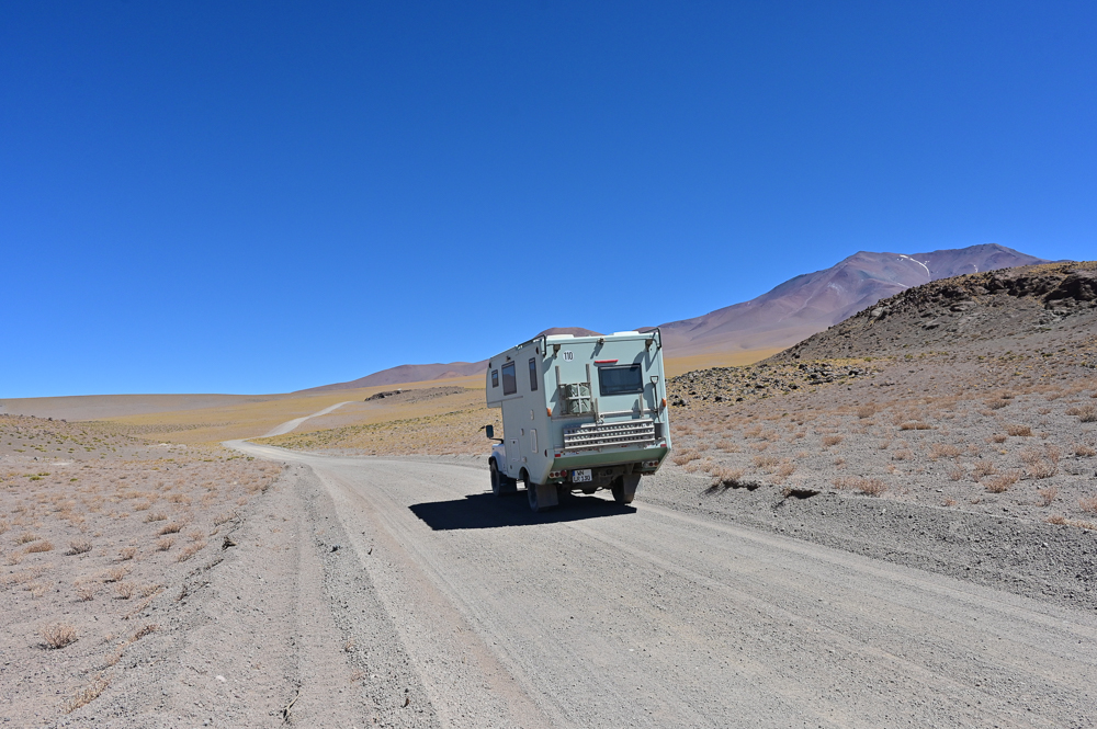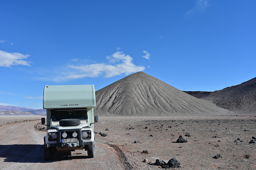 Richtung El Penon wird die Luft, aber auch der Straßenbelag immer dünner. In El Penon geht es links ab, Piste rings um den Vulkan Carachi Pampa, ein wahnsinnig schöne aber auch einsame Landschaft durch die uns der Landi trägt.