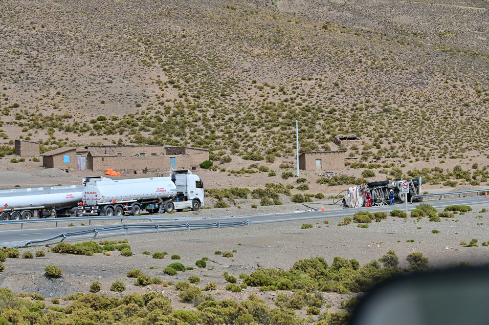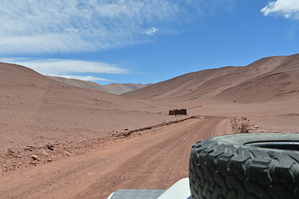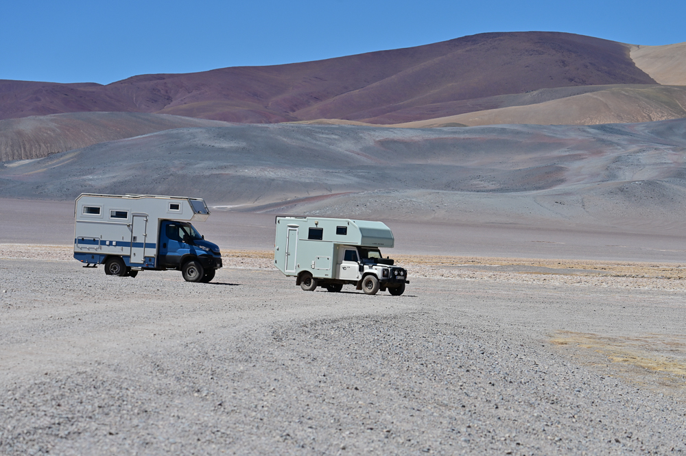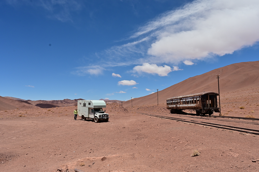 Ab dem Cono wird die Piste immer schlechter, hier fahren viele Minenfahrzeuge,Pickups und LKWs. Die Strecke führt uns noch durch die rote Disierto de Diabolo und dann „hinunter“ nach San Antonio (3800m), wo wir Freunde aus unserem Landyclub treffen.