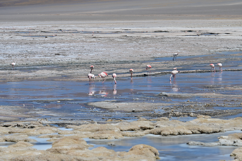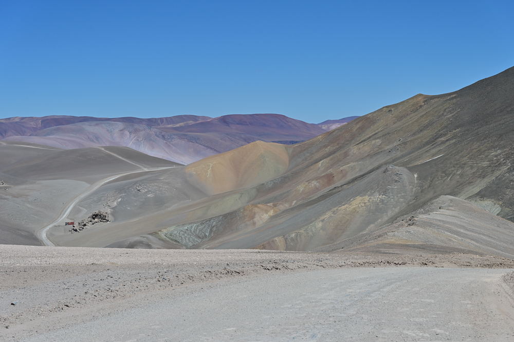 Die 50 km Piste ab der Hauptstraße beginnt bei 3200m und schraubt sich höher und höher. Sie ist gut zu befahren, da hier auch LKWs in die oben gelegene Mine fahren. Der erste Halt ist an der ersten Lagune wo wir Flamingos beobachten können, dann geht es zur Lagune Azul mit sensationellem blau. Die Berge ringsum leuchten in allen Farbe. Zwischendrin ist es aber wieder wie eine Mondlandschaft in grau und braun.