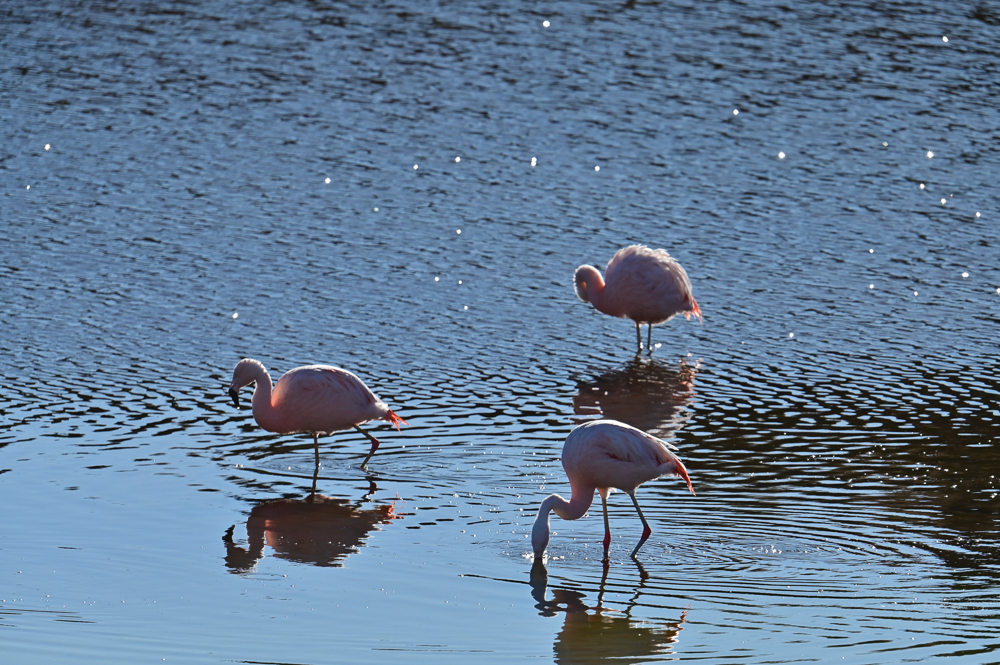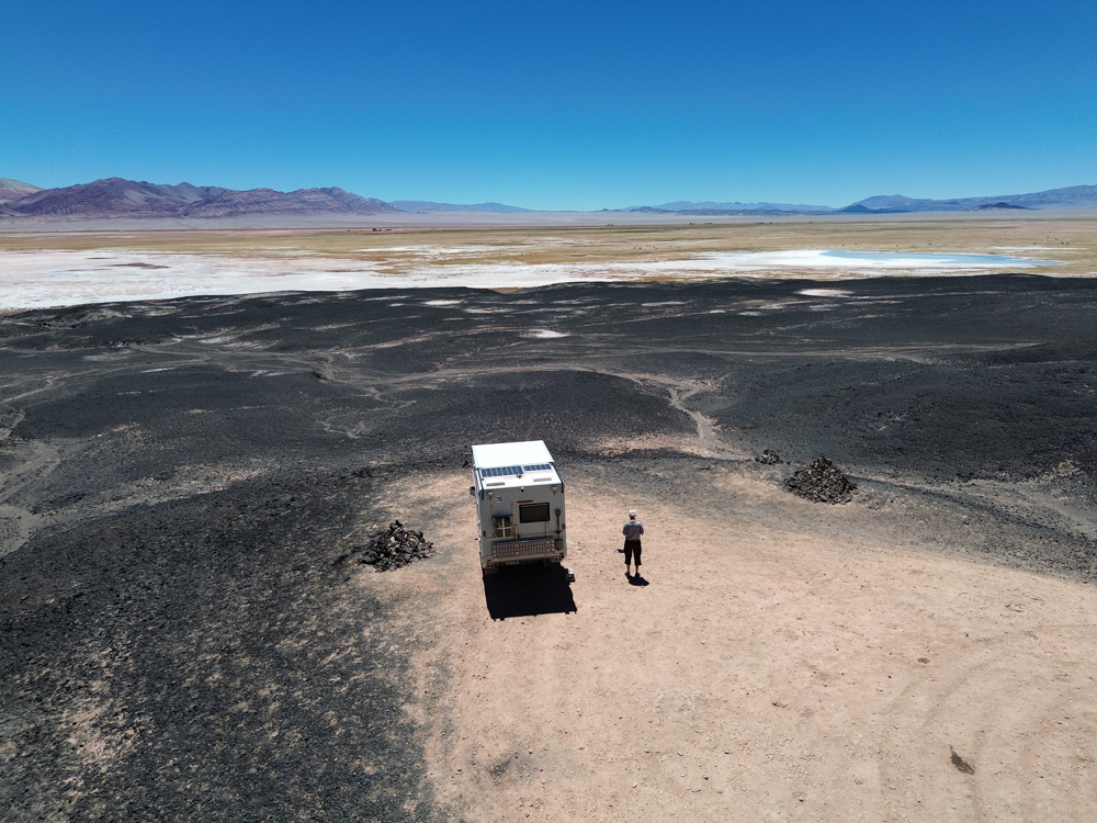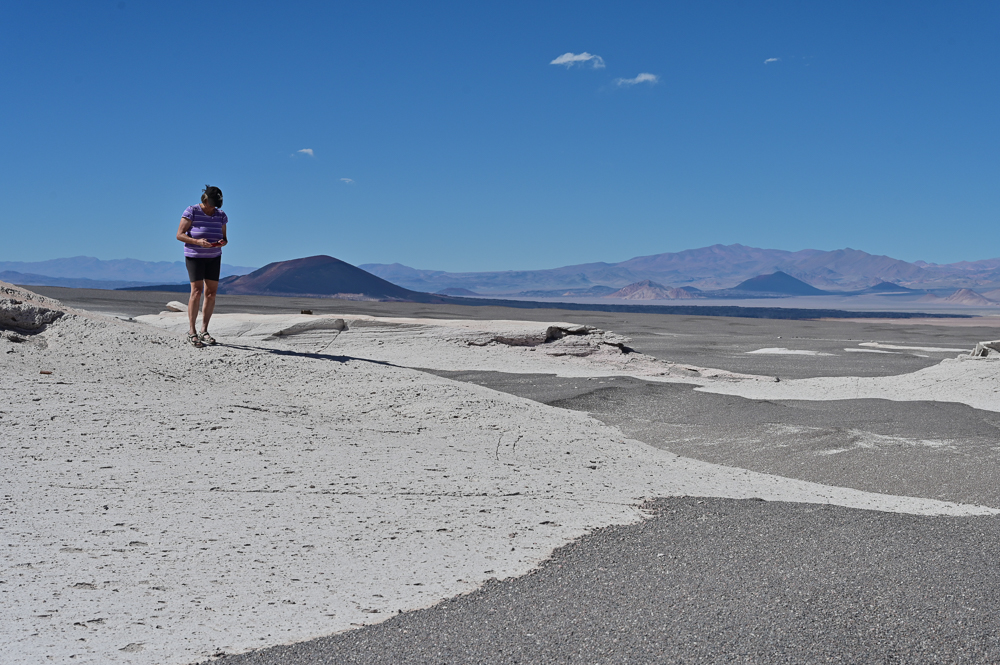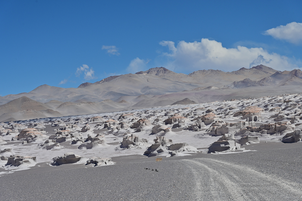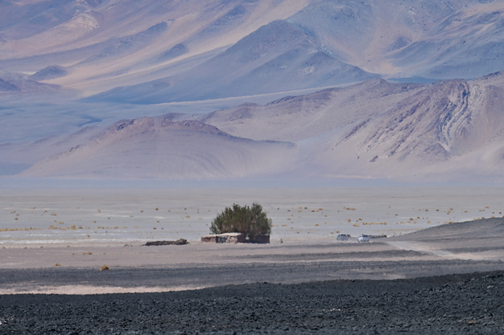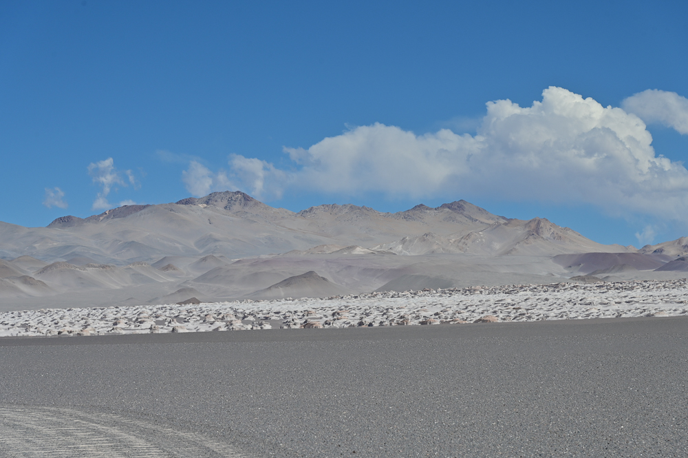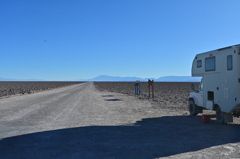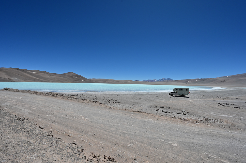 Lange haben wir auf Bekannte woanders und hier gewartet, heute sind wir es Leid und fahren los. Nach einer Nacht an der Lagune vor Antofagasta tanken wir dort noch mal Diesel und Wasser und dann geht es auf die Puna Durchquerung. Einige hundert Kilometer Einsamkeit erwartet uns. Wir fahren drei Tage, vorbei an den Tres Ojos (drei Wassertümpeln), dem Cono de Arita, einem Kegel mitten in der Lagune (Entstehung unbekannt), quer über den Tolar Grande Salzsee (ohne Wasser) bis Tolar Grande, einem Ort auf 3500m Höhe.